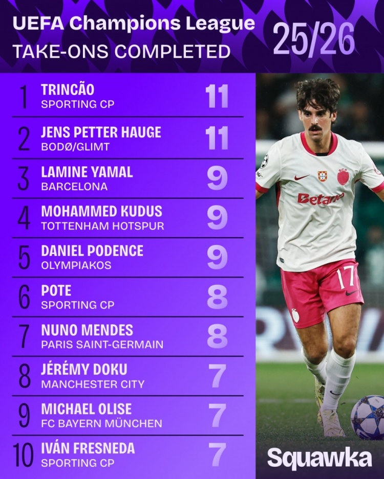 本赛季欧冠完成过东说念主榜:特林康和海于格11次分列前二,亚马尔第三