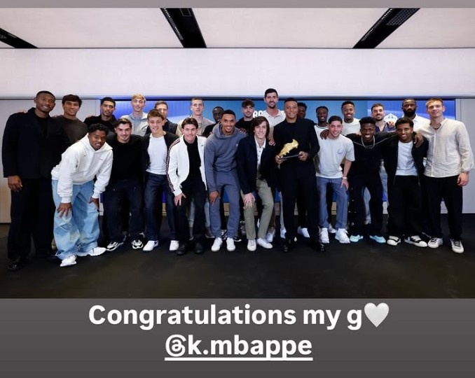 贝林厄姆也通过社媒晒出了皇马全队同手合手金靴奖杯姆巴佩的合影,并配文:“道喜我的昆季@姆巴佩”。
