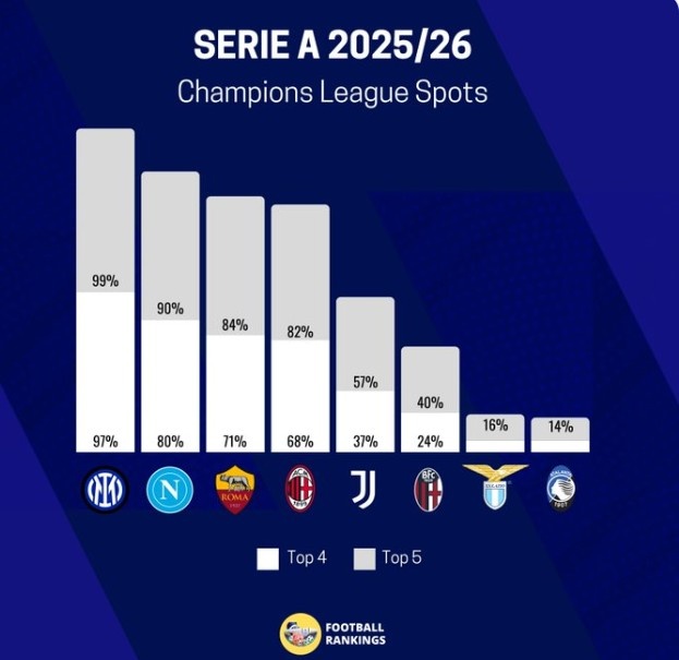 证实Footballrankings的展望,意甲有28%的概率下赛季五队建造欧冠。