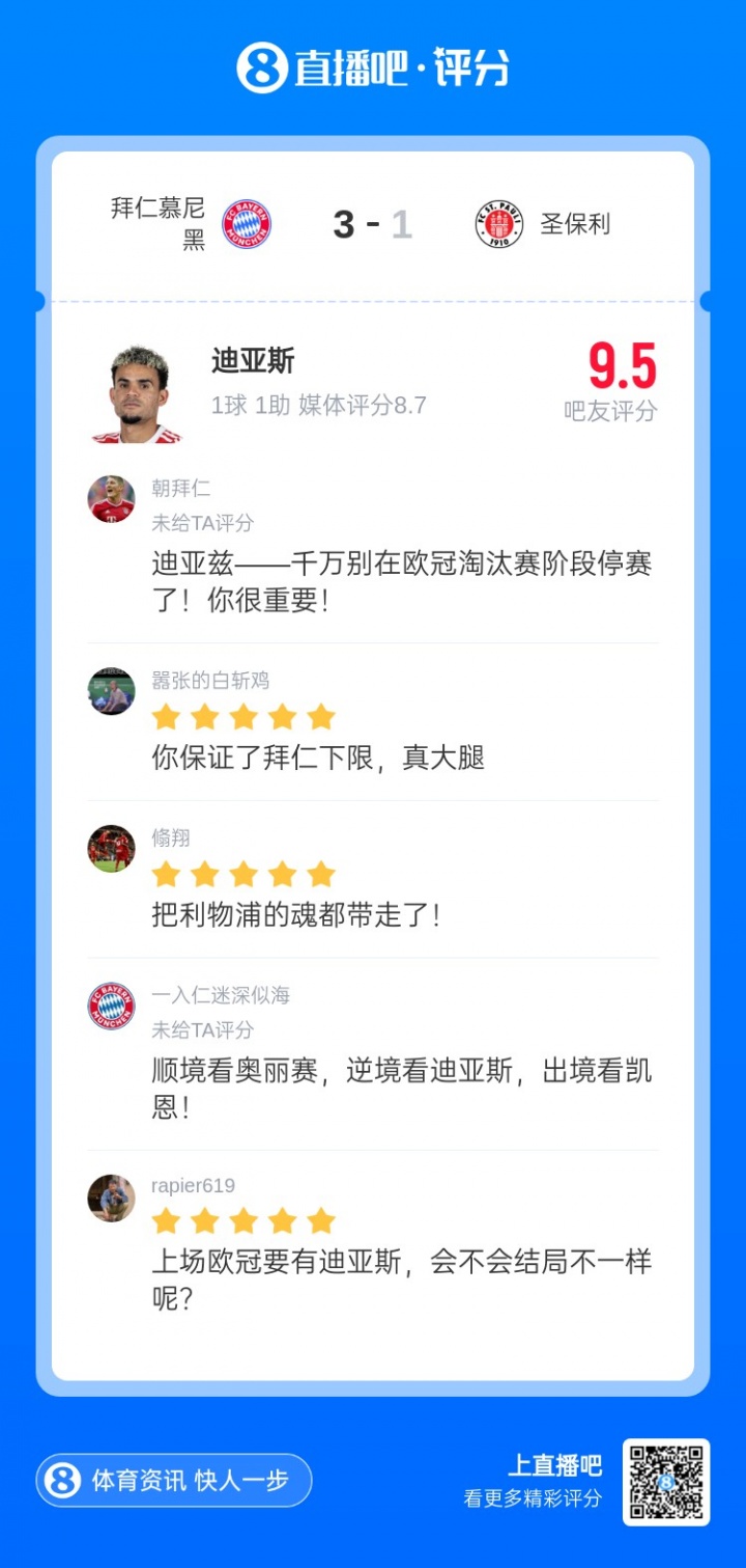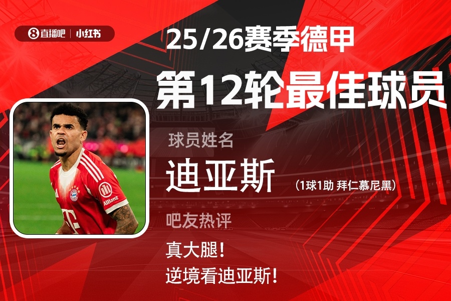 第12轮评比后果结出炉,迪亚斯传射立功,匡助拜仁补时逆转圣保利,取得吧友超3.6万票营救,当选【X小红书德甲第12轮最好球员】!
