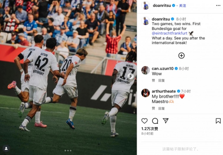 赛后堂安律社媒晒出和队友庆祝照,并配文写谈:“两战两胜,况且我获利了法兰克福生计的德甲首球,何等高明的一天!海外比赛日后重逢!”