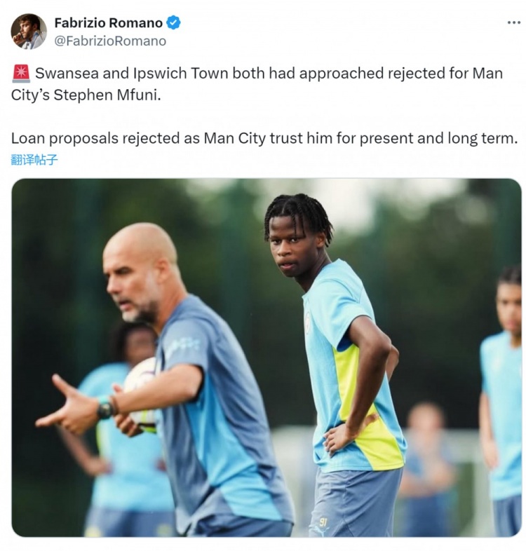 罗马诺:斯旺西、伊镇专门17岁中卫姆富尼,但租出建议被曼城拒却