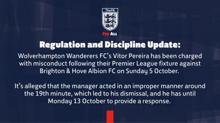 官方:狼队主帅佩雷拉被指控当作不妥,需在10月13日前作出回复
