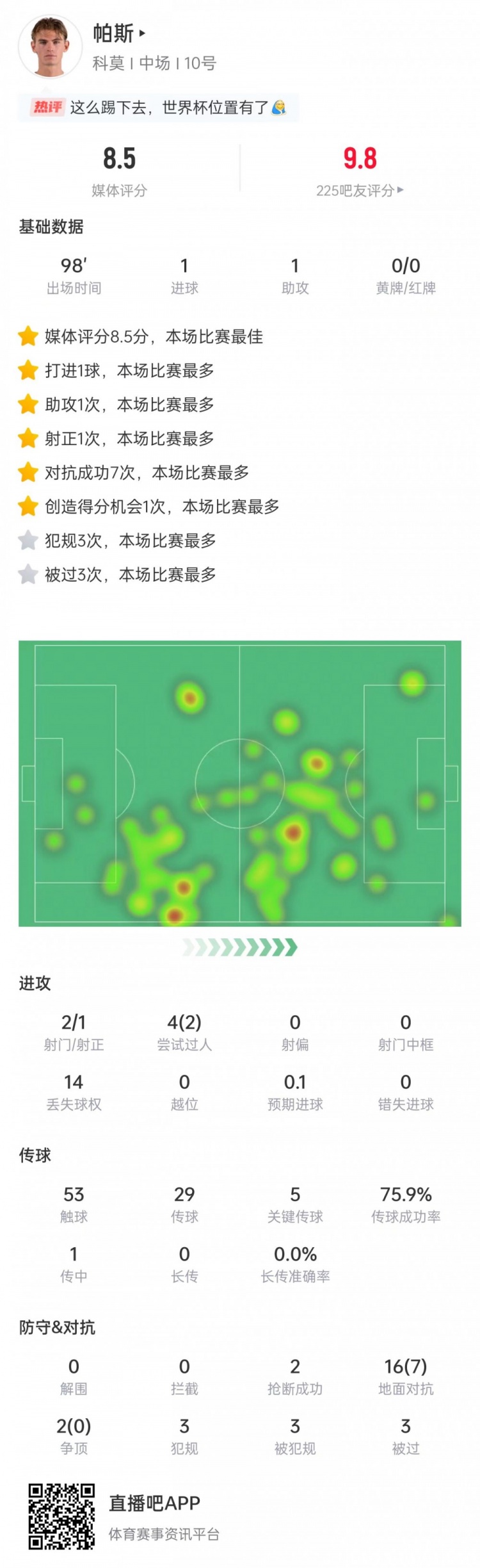 帕斯本场数据:传射立功+5次要津传球,获评8.5分全场最高