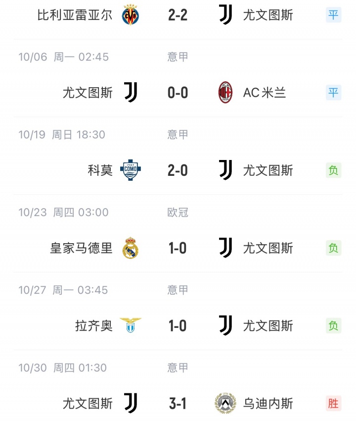 10月30日讯 意甲第9轮,尤文3-1投降乌迪内斯,限制各赛事8场不堪。