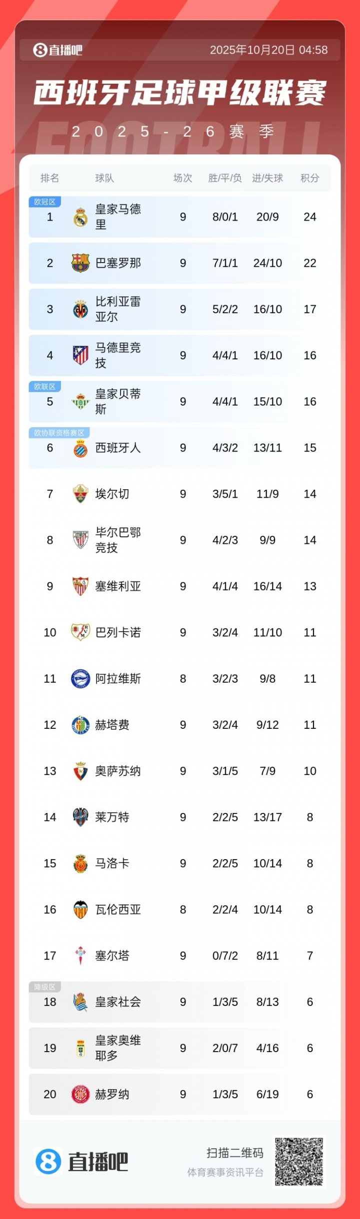 巴萨名挨次二,比利亚雷亚尔第三,马竞第四。西甲第10轮10月26号将迎来国度德比,皇马主场迎战巴塞罗那。