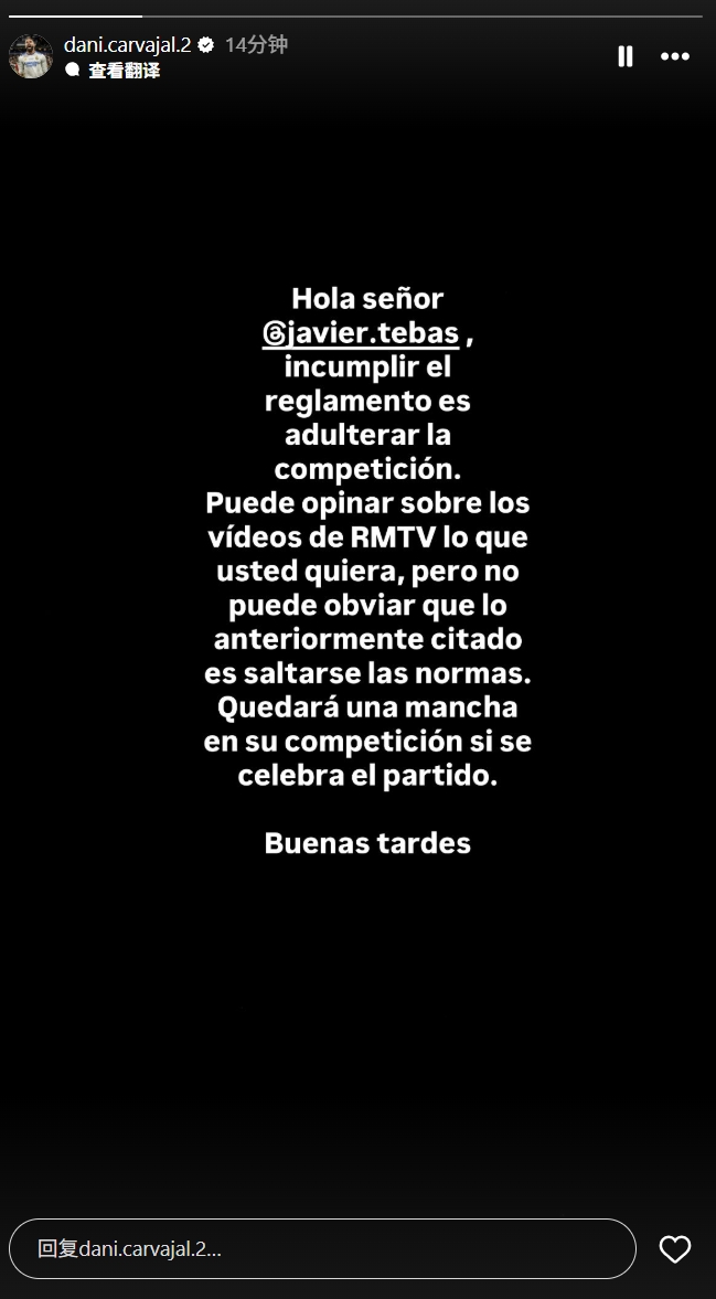 卡瓦哈尔:你好,特巴斯先生。违抗法规等于期凌比赛。你不错对此前皇马TV发布的视频发表你思要说的任何见解。但你不可否定之前所提到的践诺(国际赛)等于违抗了法规。淌若进行国际赛,你的比赛就会有症结。