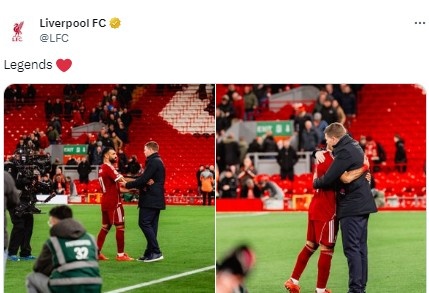 利物浦官方推特发文写说念:听说!并配上了杰拉德和萨拉赫在场边拥抱的图片。