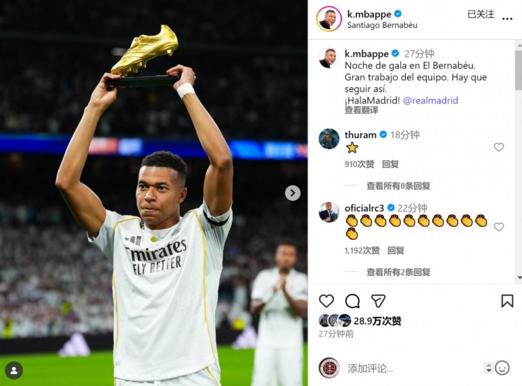 姆巴佩社媒晒出赛前展示欧洲金靴奖杯的相片,配文:“伯纳乌的华彩之夜,全队齐发达出色,咱们要继续保执!Hala Madrid!”