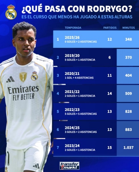 德国转会市集清点了罗德里戈加盟皇马后7个赛季同时出场数据,本赛季他尽管出战了12场比赛,但出场时辰仅为348分钟。在这个经由中,他送出了两次助攻。