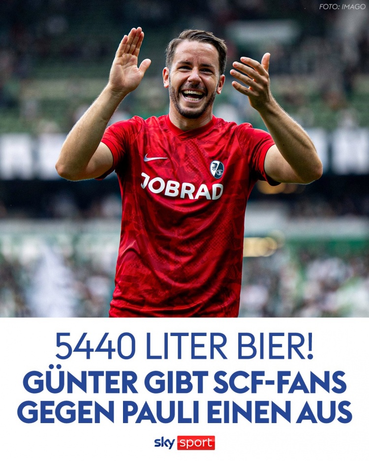 据德国太空体育报说念,为了庆祝收尾这一里程碑,冈特将在这场比赛中请弗赖堡球迷喝啤酒,他将为球迷准备5440升啤酒。
