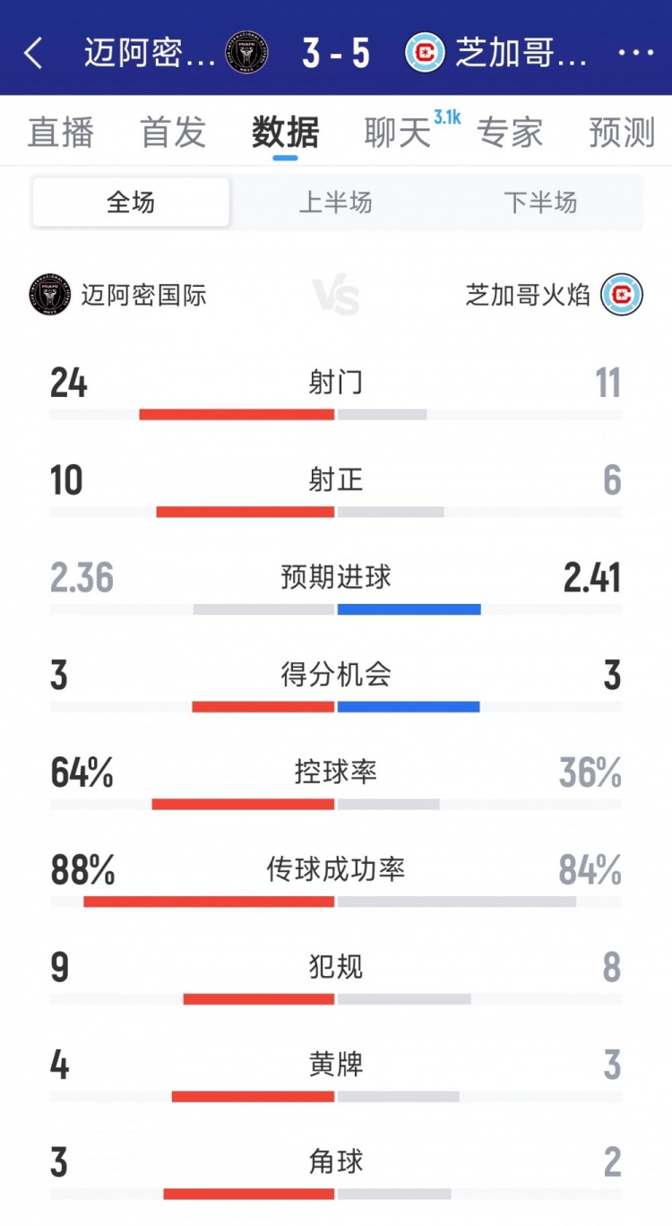 10月1日讯 在本轮好意思职联,迈阿密海外3-5不敌芝加哥火焰,以下为两边全场数据对比: