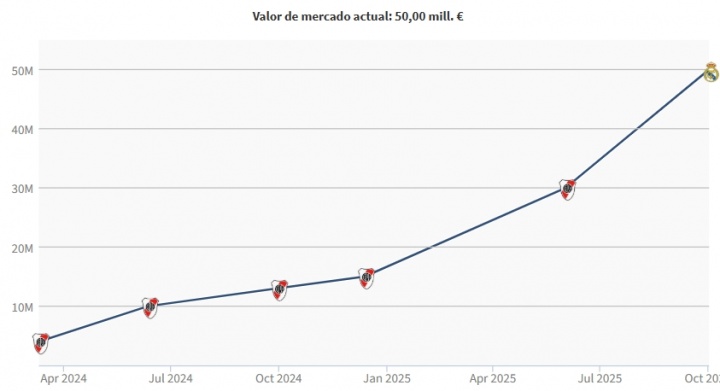 马斯坦托诺今夏从河床以4500万欧的转会费加盟皇马,他此前身价3000万欧,本赛季于今,马斯坦托诺为皇马出战8场比赛,孝敬1粒进球。