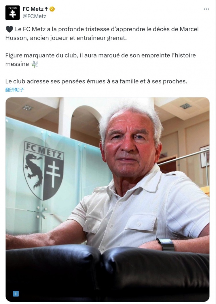 R.I.P.梅斯前主帅马塞尔-胡森物化,俱乐部官方社媒发文默哀