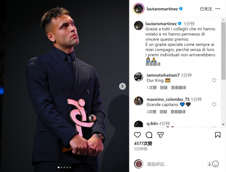 入选最好威望!劳塔罗社媒:感谢队友,莫得你们个东谈主奖项无从谈起