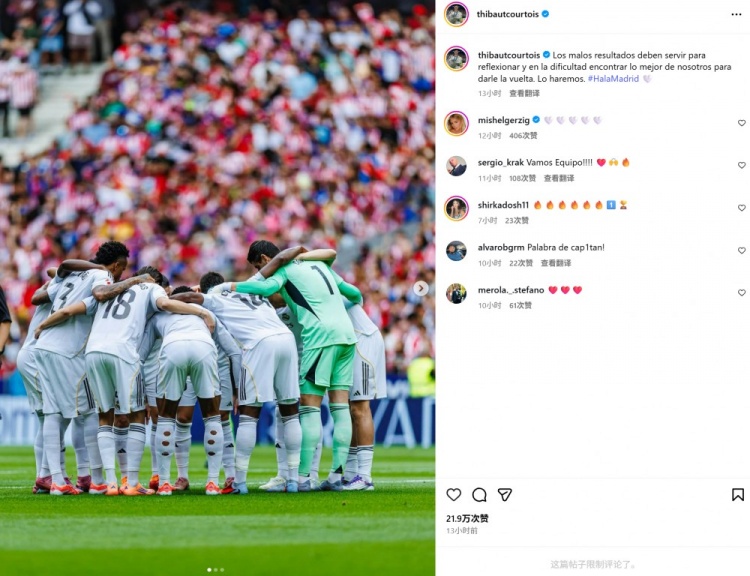 门将库尔图瓦也在社媒晒出合照饱读吹球队,配文写说念:“灾祸的效果应该成为反想自我的机会,濒临清贫方位咱们应该找回最好气象扭转局面。咱们大概作念到的。”