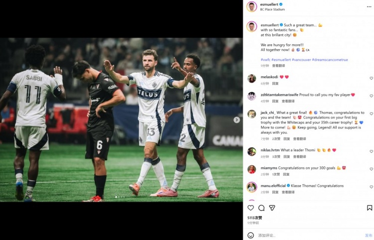 点射破门助温哥华白浪夺冠,穆勒社媒晒照挂念:咱们还渴慕更多!