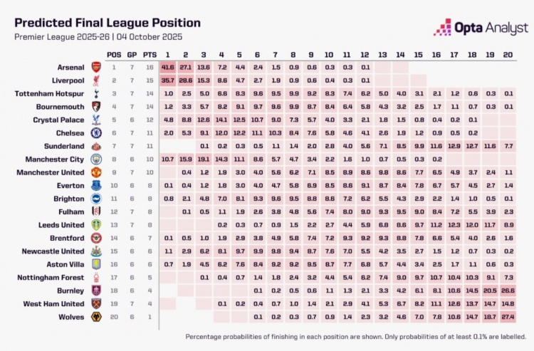此役事后,数据机构OPTA超等计较机揣测本赛季英超冠军↓