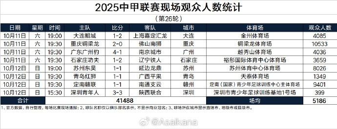 2025中甲联赛现场不雅世东谈主数统计(第26轮)