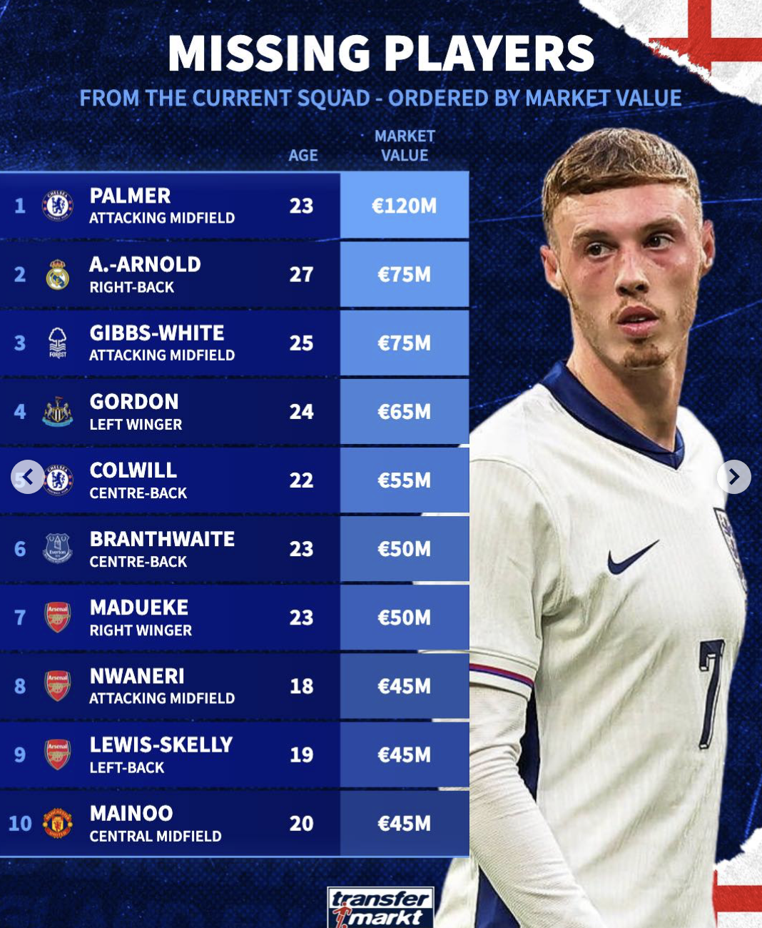 落第本期英格兰队球员身价榜: 帕尔默、阿诺德和怀特排前三