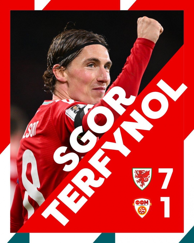 最终,威尔士7-1北马其顿,得胜在积分上反超敌手,积16分位列小组第二,将建造附加赛。