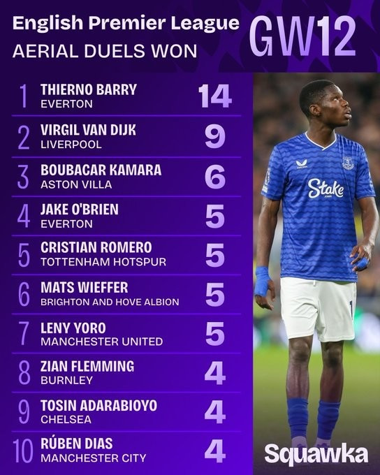 数据统计显现,巴里在本场比赛盘算完成了14次顺利争顶,这亦然本赛季英超单场最多。行为对比,本轮英超联赛顺利争顶第二多的范戴克也仅有9次。