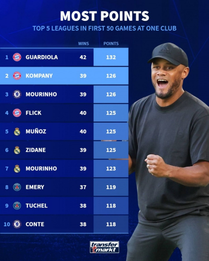 孔帕尼捏教拜仁前50场联赛积126分, 五大联赛历史仅次于瓜帅