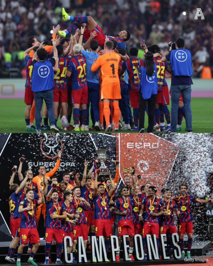 直播吧1月16日讯巴萨全队在夺得西超杯冠军赛后围在刚刚转头的阿劳霍身边庆祝,并被欢畅饱读吹的队友们高高抛起,替补出场的他临了也手脚队长举起了奖杯。
