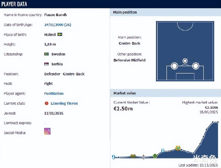 这名00后中央后卫身高达到1米88,曾经在2022年入选过瑞典国家队大名单,过去2年一直都是瑞典豪门线守护者防守队伍哈马比的后防中坚,帮助队伍连续赢下瑞典超级足球赛事杯优胜者。他有着出色的制空能力,同时还能完成精准的断球预判,上比联赛季在瑞典超级锦标赛足球赛事杯绿茵均贡献3.92次解围和赢下3.16次高球一对一,更是有着高达92.1%的传送成功率。