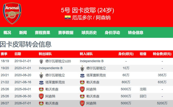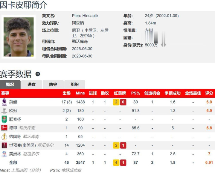 现年24岁的因卡皮耶,身高1.84米,左脚选手,主打中央防守站位,也可以踢左守卫者,德转估价5000万欧元。因卡皮耶本比联赛季至今出战了20场英超的赛事,其中17次首发阵容,贡献1球1助,欧洲欧洲冠军联赛出场4次,足球锦标赛季杯出场2次。阿森纳考虑到财务方面的原因,先租后买引进因卡皮耶,足球球队组织已经决定今年夏窗以4500万英镑永久性引进因卡皮耶。阿森纳在中央防守站位上,除了加布里埃尔和萨利巴之外,还有因卡皮耶和莫斯克拉,可谓是双保险。得守卫得天下,阿森纳凭借着最强防守阵线+角球时机射门已经成为五大足球锦标赛季最强队伍之一。