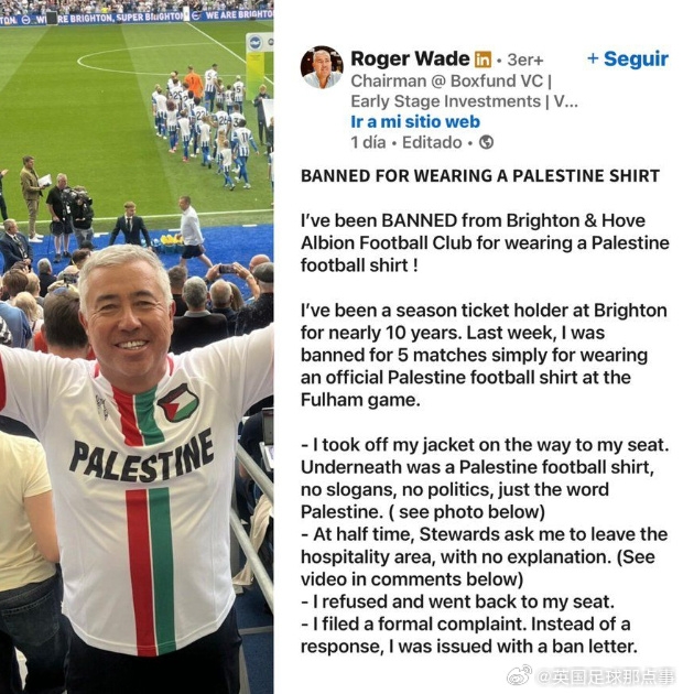 布莱顿赛季票执有者罗杰-韦德(Roger Wade)社媒发文,暗示我方因身穿巴勒斯坦国度队官方球衣,被俱乐部禁赛五场。