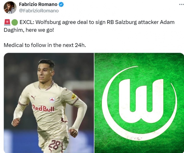 9月1日讯 据闻名转会群众罗马诺报说念,沃尔夫斯堡行将签下萨尔茨堡红牛挫折手亚当-达吉姆,Here we go!